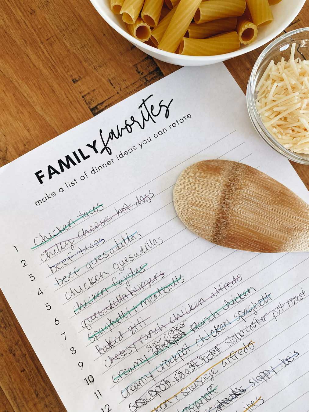 Then, select five dinners you will cook each week from the ideas you drafted in Step 1 in no particular order. I choose five meals instead of seven because I personally don’t like to cook every single night (and if that’s you too, you’re my people!).